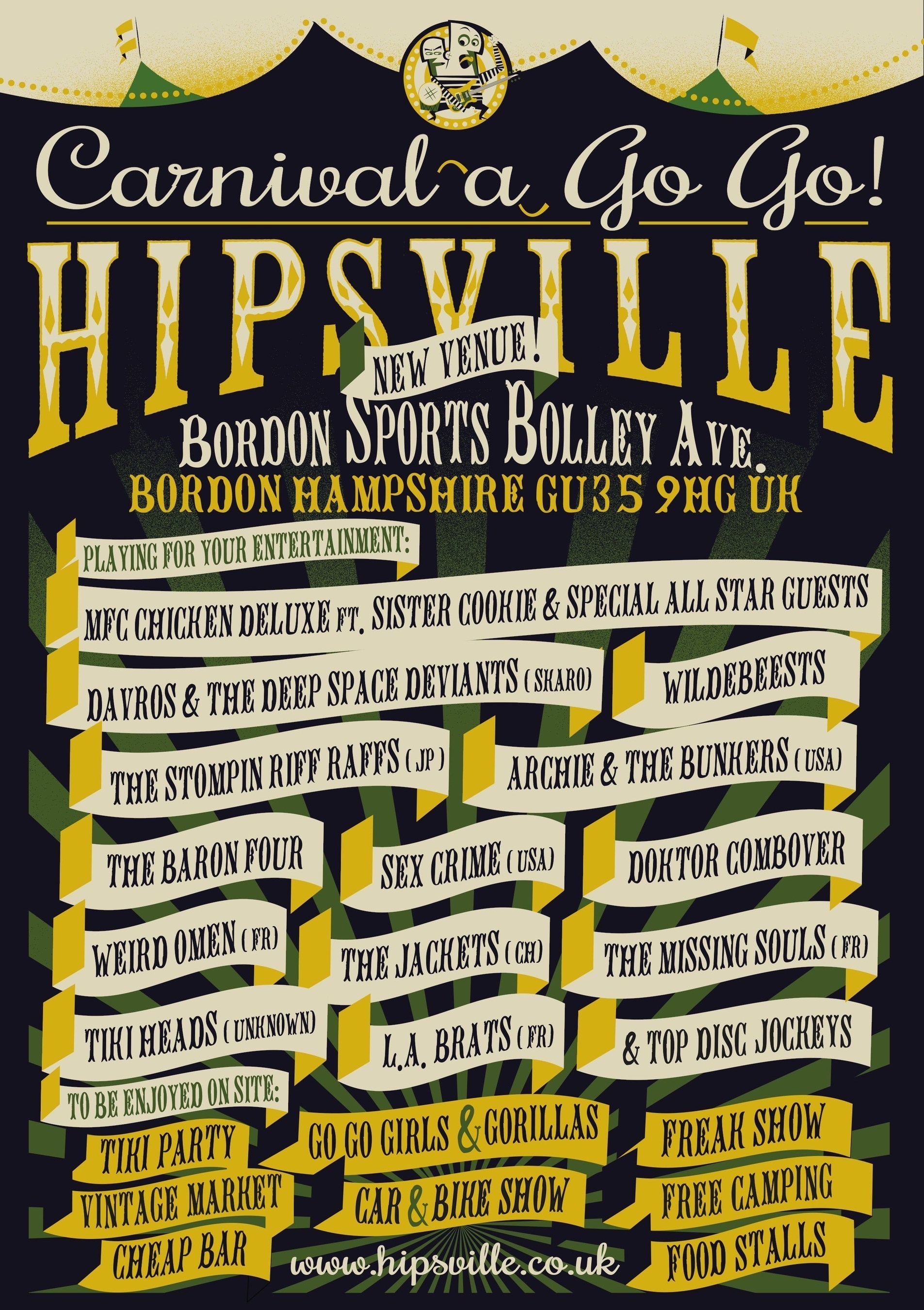 HIPSVILLE A Go Go! [http://www.hipsville.co.uk ] is where crazy people from all the corners of Europe, and beyond, get together to dance and party at a carnival-themed weekend to the wildest rock’n’roll and soul sounds of the 1960s and beyond! With thirteen live bands, top international DJs, caged go go dancers, hot rods and gorillas plus a whole bunch of people looking for a good time, that’s HIPSVILLE Carnival A Go Go!